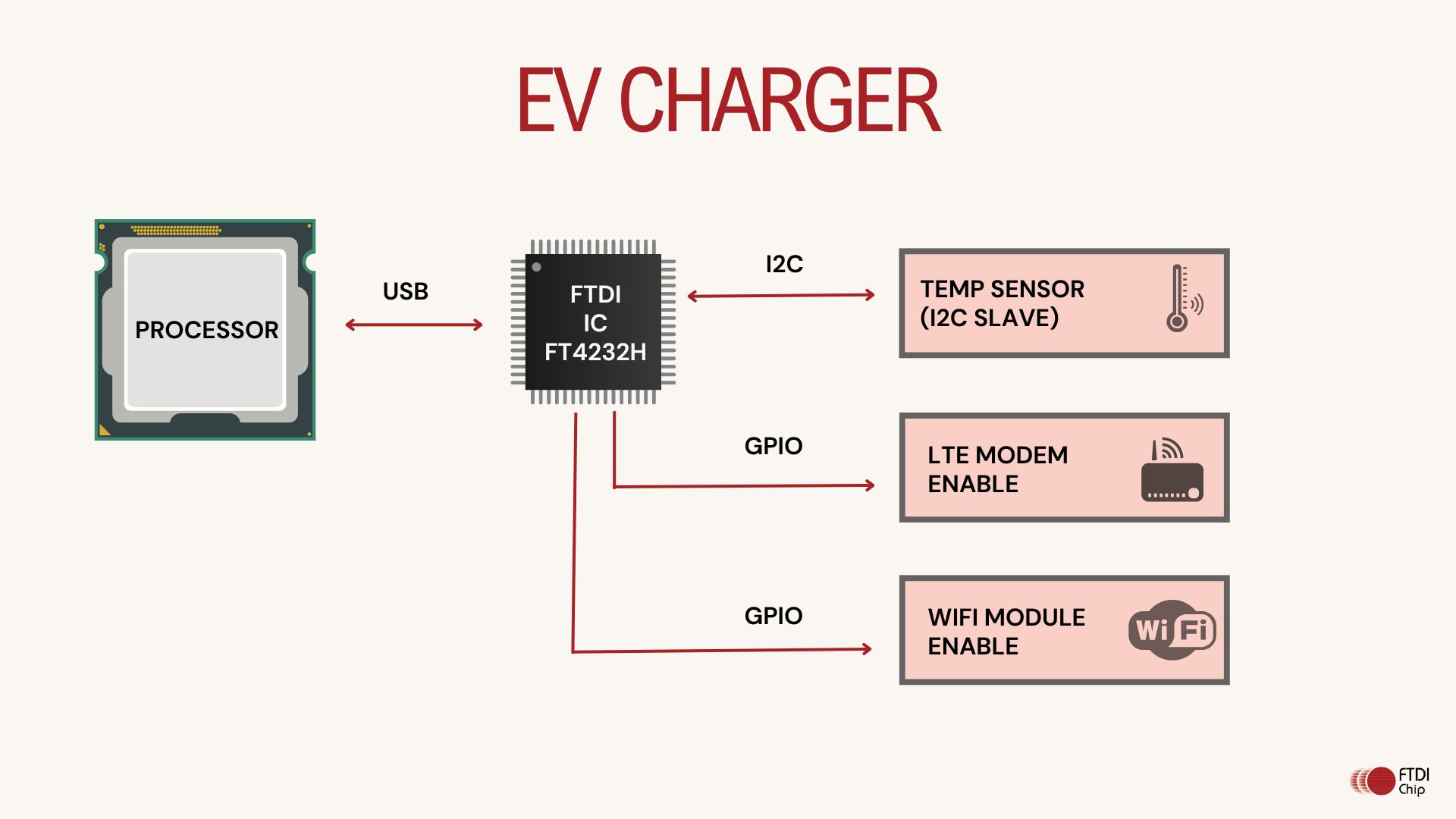 Here is a simple block diagram of how the FT4232H can used with the EV charger’s wireless interface: