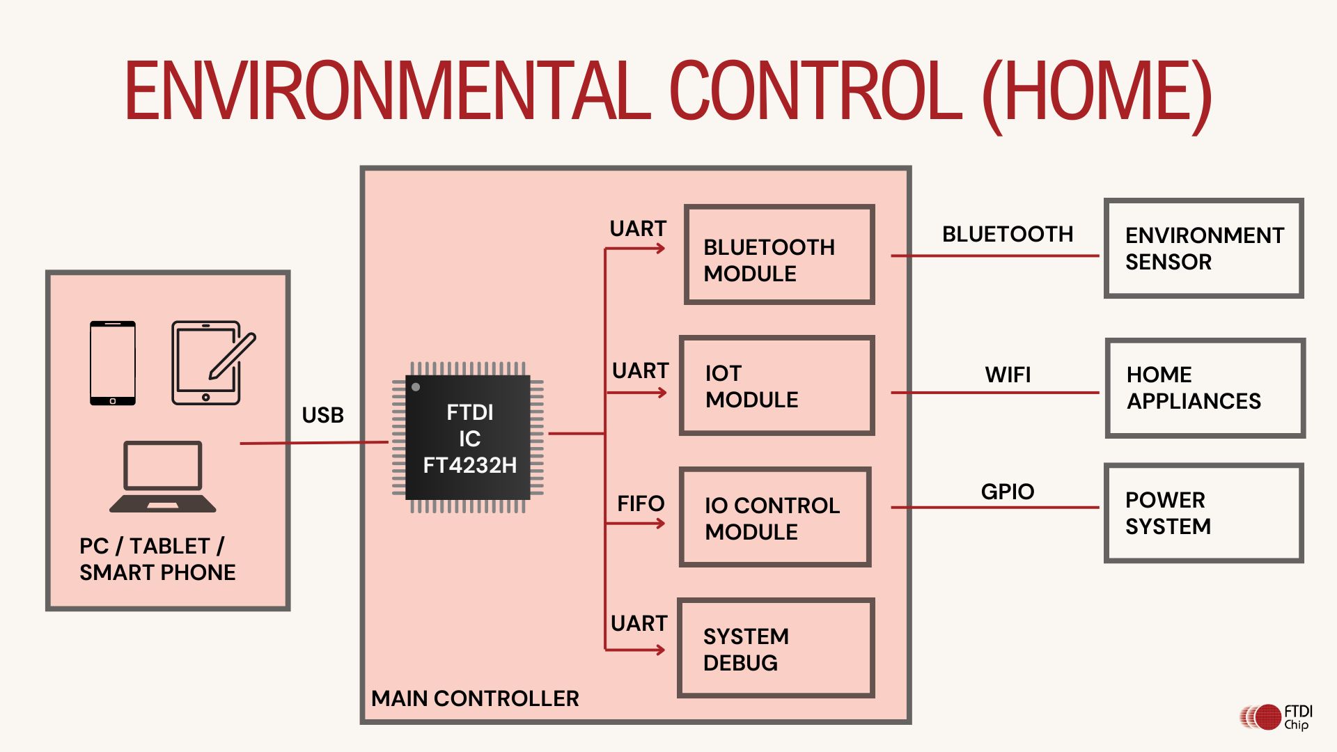 FTDI products can be integrated into an environment control system to read data from sensors via various IO interface and control different equipment.