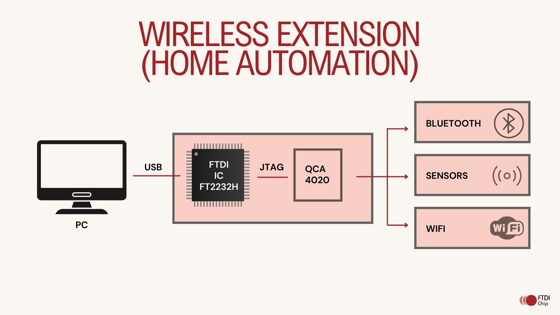 An example of FT2232H used in Home Automation is with the QCA4020 SoC which is a multi-mode system-on-chip with support for dual-band Wi-Fi, Bluetooth 5 and 802.15.4-based technologies, including Zigbee and Thread.