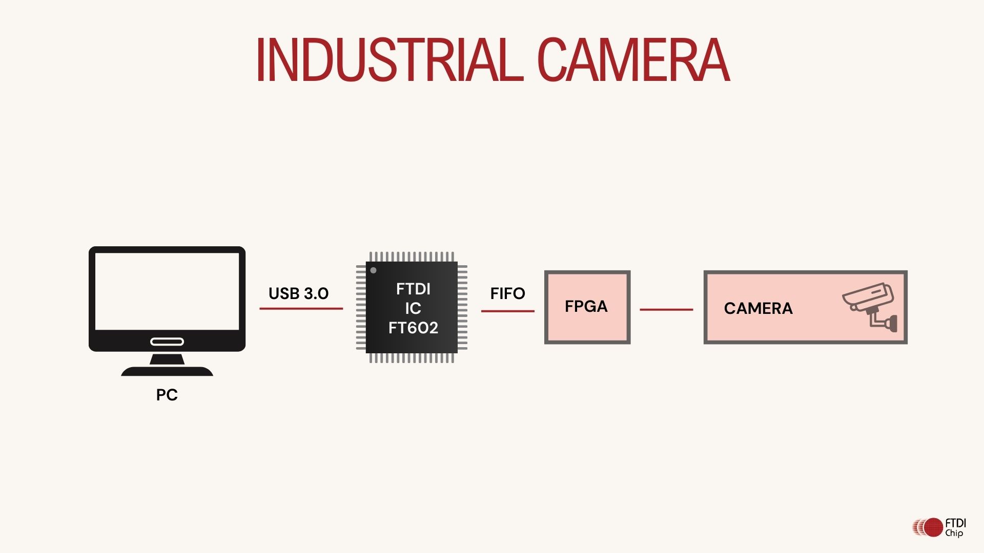 Below is a block diagram example of how the FTDI device FT602 can be integrated into an Industrial Camera system.