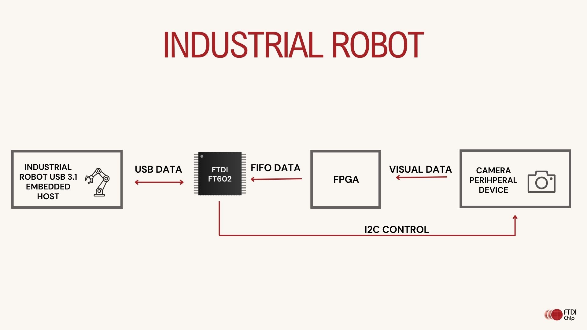 FTDI’s FT602 can be used to integrate a camera peripheral to provide vision for an industrial robot in a manufacturing setting. An FPGA reads data from a camera peripheral device, modifies the data if needed, and sends the data to the FT602, which will communicate with the embedded host. The FT602 can also use I2C to configure the camera peripheral device as well.